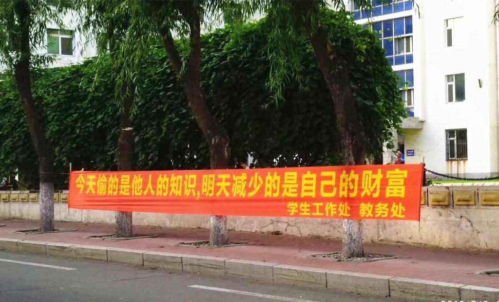 条幅的内容,有的“很可怕”,比如:严肃考试纪律,违纪处分当日下达,全国包邮(比你先到家)。有的“很淘气”,比如:考试不是打CS,不需要耳听六路、眼观八方;考试不是逛淘宝,不用集体动作、竭诚合作;考试不是谈恋爱,请不要眉目传情;考试不是打dota,请不要抱团合作。有的“很走心”,比如:今天偷的是他人知识,明天减少的是自己的财富;诚信考试“神州行”,本分做人“全球通”。