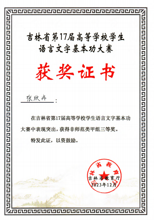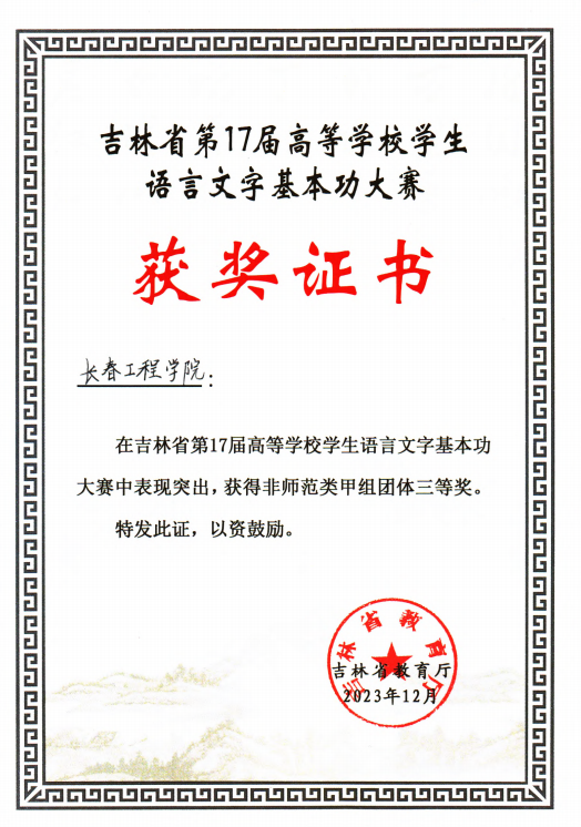 近日,由吉林省教育厅、吉林省语言文字委员会主办,吉林省普通话培训测试中心、吉林教育电视台承办的吉林省第17届高等乐鱼学生语言文字基本功大赛圆满落下帷幕。我校获得非师范类甲组团体三等奖,国际教育学院学生张欣冉获非师范类甲组三等奖。
