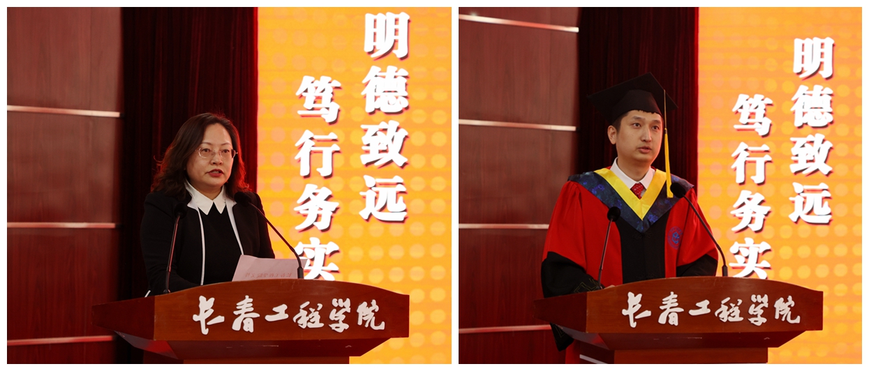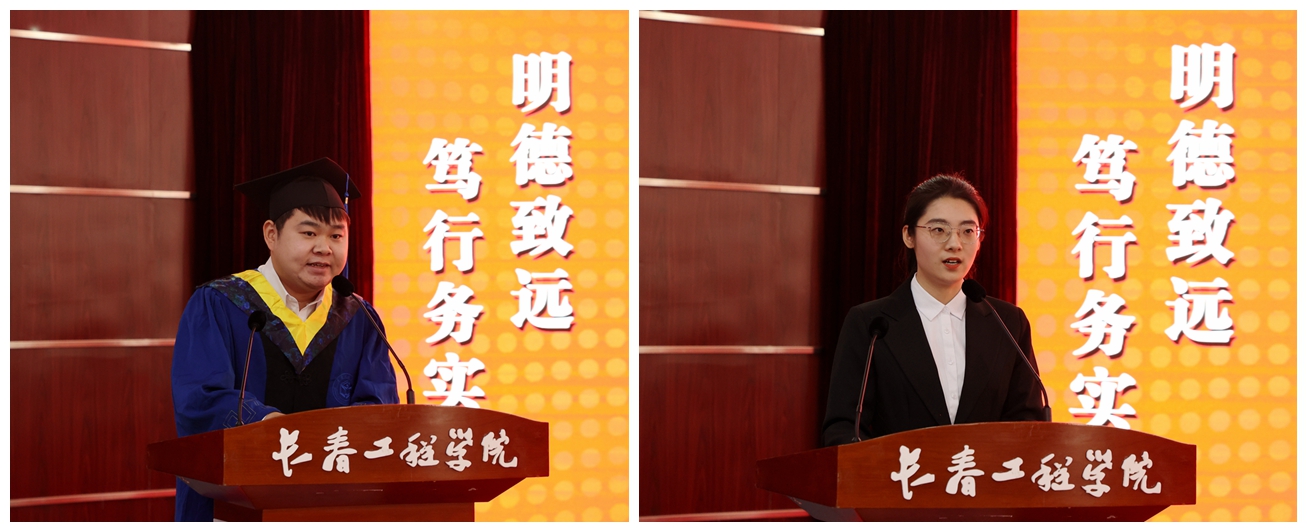 毕业研究生代表陈立和在校研究生代表王杰在典礼上发言,向各位领导、老师们表达了最深的敬意和感激之情。