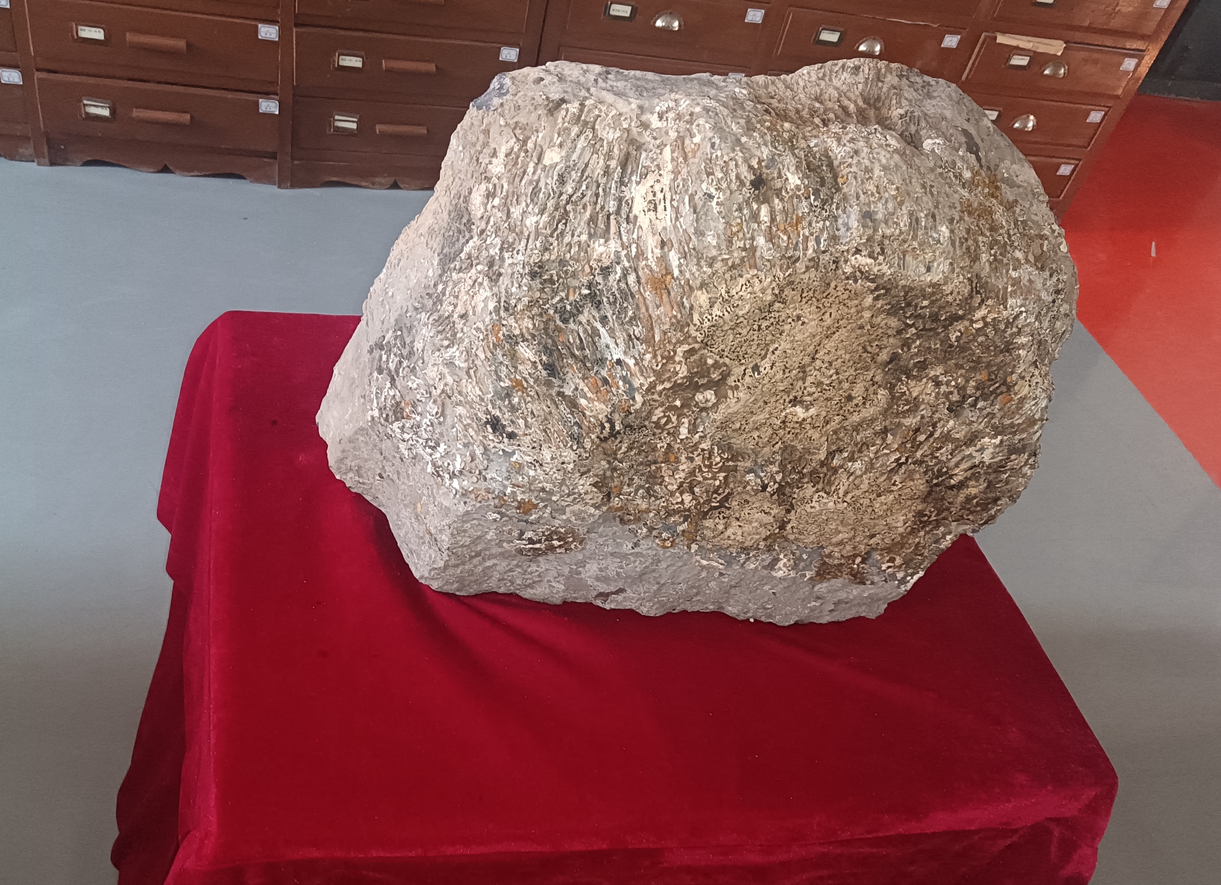 该标本重达80公斤,形成于晚古生代石炭纪早石炭世,成岩于石炭系下石炭统臭牛沟组,是划分石炭系的“时间指针”,也是研究生命起源和演化、研究古地理和古气候、分析地壳运动等重要依据,具有极高的学术价值与收藏价值,目前已收藏于勘查与测绘工程学院地质馆。