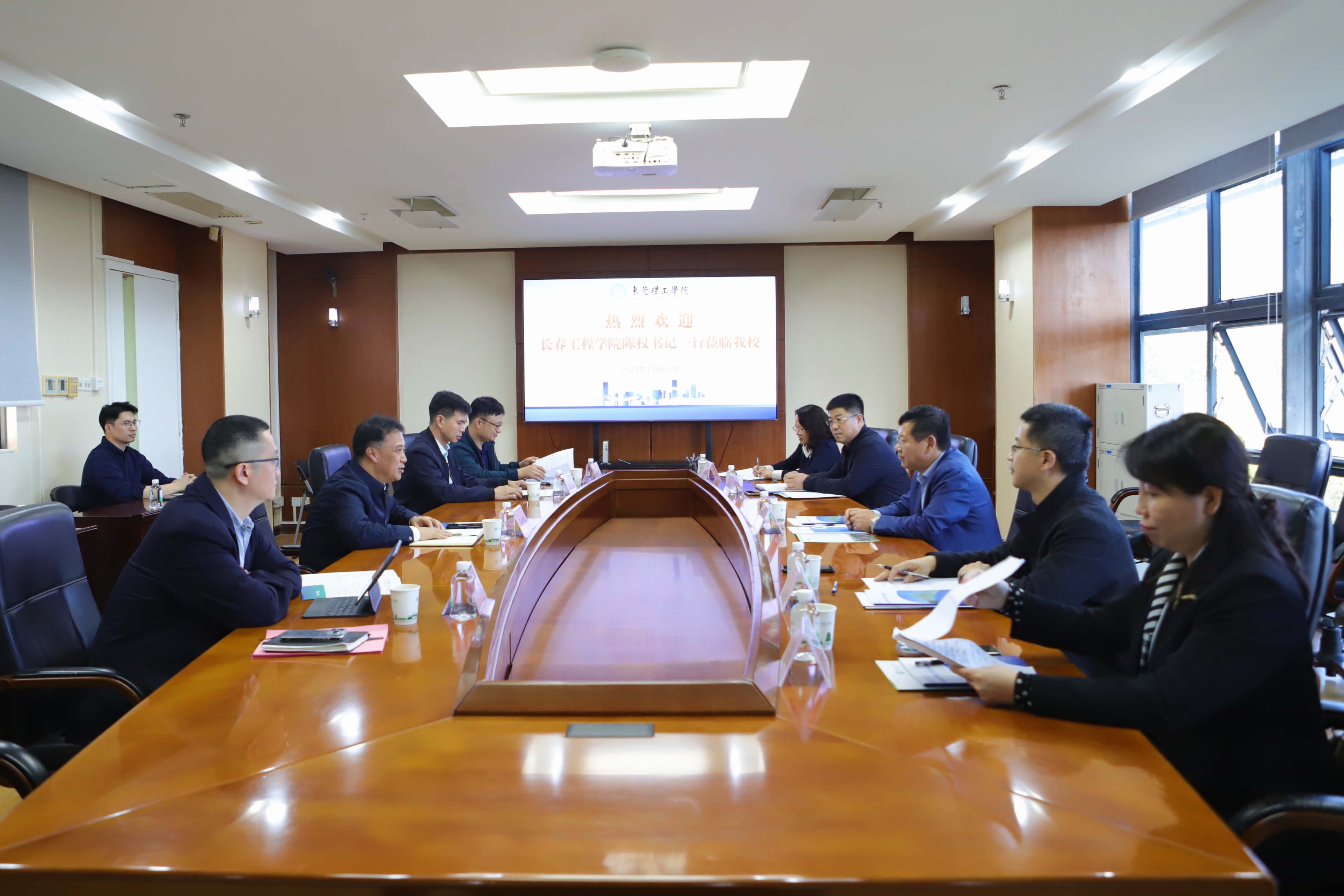 在东莞理工学院,党委副书记、校长马宏伟对陈权书记一行表示热烈欢迎,并在座谈会上详细介绍了东莞理工学院新型高水平理工科大学建设情况。他表示,东莞理工学院深化教育改革,积极培养卓越工程师,与多方资源合作对接,搭建实践教学、科研攻关、成果转化、创新创业等平台,提升学生实践能力和创新思维。瞄准科技前沿和产业需求,推进科技创新与产学研深度融合,推动科技成果转化。建设现代产业学院,深化产教融合,深入推进新工科建设,办“扎得深、立得稳、靠得住、顶得上”的新型高水平理工科大学,服务支撑地方高质量发展。陈权书记简要介绍了我校的事业发展情况,他对东莞理工学院在校企合作、产教融合等方面取得的一系列标志性成果表示钦佩,希望以此次调研为契机,充分学习东莞理工学院在打造东莞高端创新人才培育基地和国际创新资源集聚区等方面的先进经验,持续加深两校友谊,推动两校在高质量发展中实现共赢。