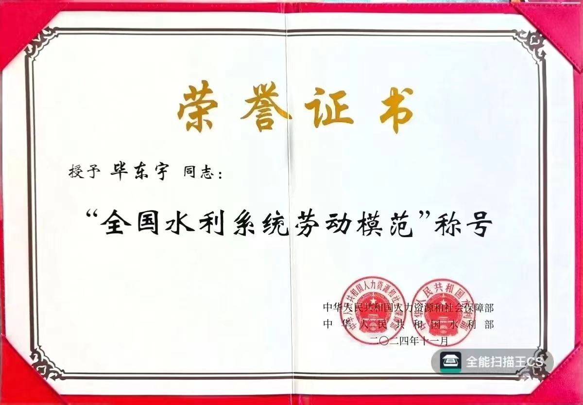 毕东宇校友荣获“全国水利系统劳动模范”荣誉称号