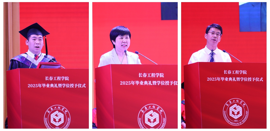 市政与环境工程学院的刘亮同学, 吉林省教学名师、长春市师德标兵侯丽华,一汽解放集团国际汽车有限公司副总经理史金城分别作为毕业生代表、教师代表和优秀校友代表发言。