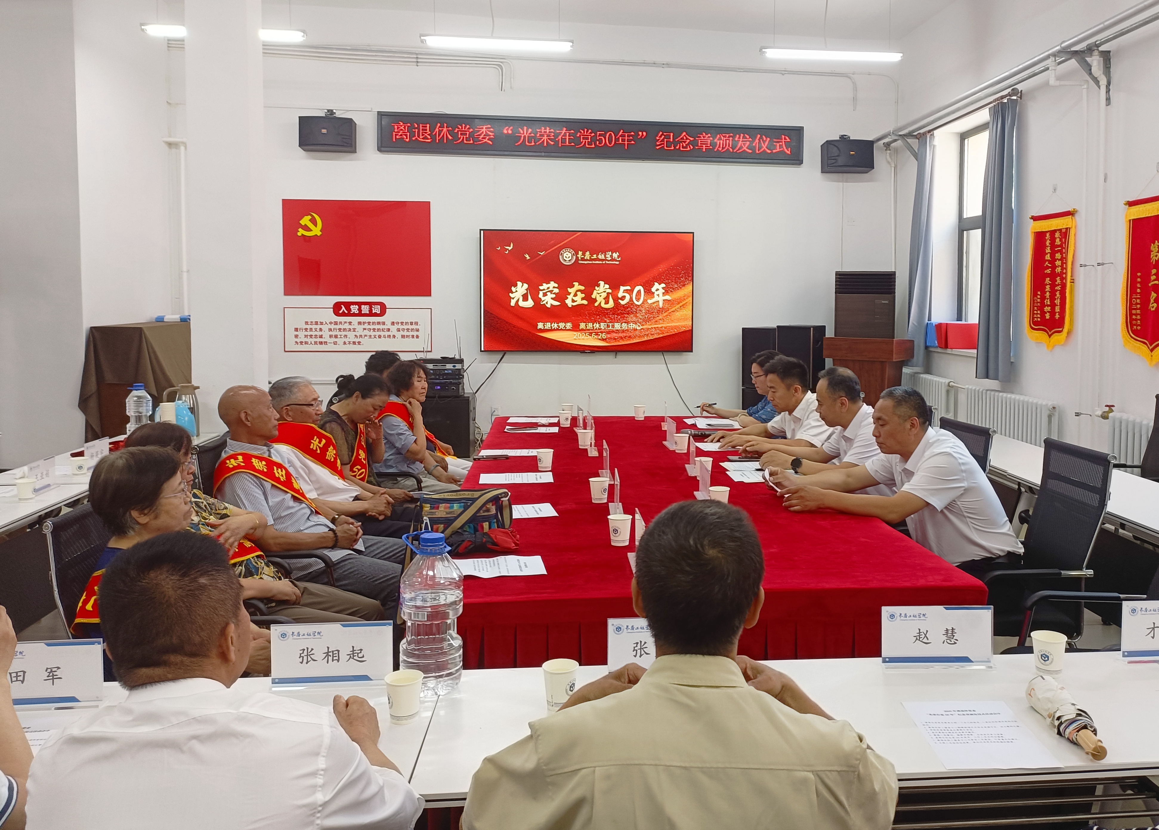 在中国共产党成立104周年来临之际,6月26日,乐鱼“光荣在党50年”纪念章颁发仪式在离退休职工服务中心会议室举行。荣获纪念章的老党员,乐鱼相关部门负责人,离退休党委各党支部书记参加会议。