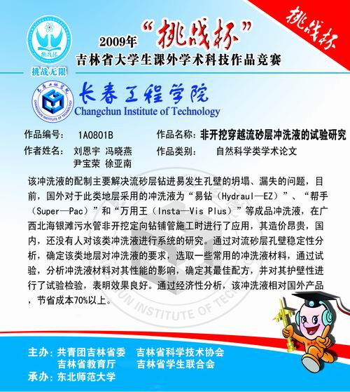 6月12日晚,由共青团吉林省委、省科协、省教育厅、省学联联合举办的2009年吉林省“挑战杯”课外学术科技作品竞赛顺利落下帷幕。