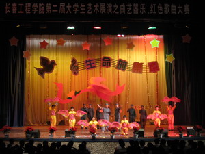 大学生活动中心灯光闪烁,掌声雷动,一首《红旗飘飘》拉开了大赛帷幕。本次大赛师生同台献艺,节目异彩纷呈。有乐器合奏《花儿与少年》,红歌串烧《红星闪闪》、《全民皆兵》,歌伴舞《红色岁月》,歌舞剧《我们成长了》,师生们在节目中以各种艺术形式抒发了工程人的爱国之情,表达出了对地震灾区同胞的深深祝福和真诚鼓舞,也以工程学子的青春和热情展现了对奥运的祝福和期待。情感的撞击、共同的心声,使台上台下达成了强烈共鸣。一个个精彩的节目,让我们在音乐中回味难忘的岁月,在感动中,怀念先辈们是怎样在艰难中唱着红歌风雨兼程。