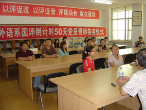 最后,外语系全体党员在题为“外语系国评倒计时50天党员誓师签字仪式”的条幅上郑重的签下了自己的名字,接受群众的监督。