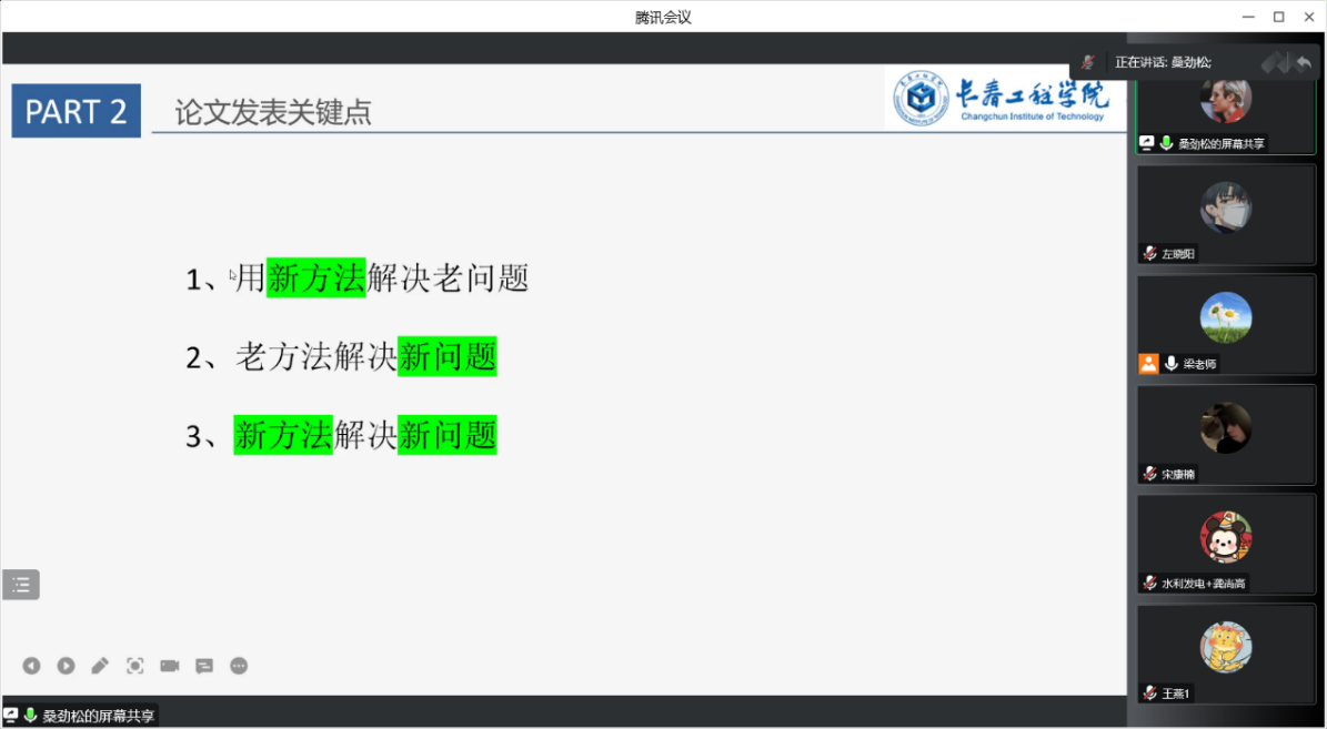 谭见文同学结合自己的研究方向及在竞赛中积累的经验和取得的成绩,分享了论文撰写的架构、内容及发表方面的相关经验。他强调,在论文写作时一定要严谨,阅读大量文献后要善于总结自己的创新点,尽量引用影响因子高的文献。