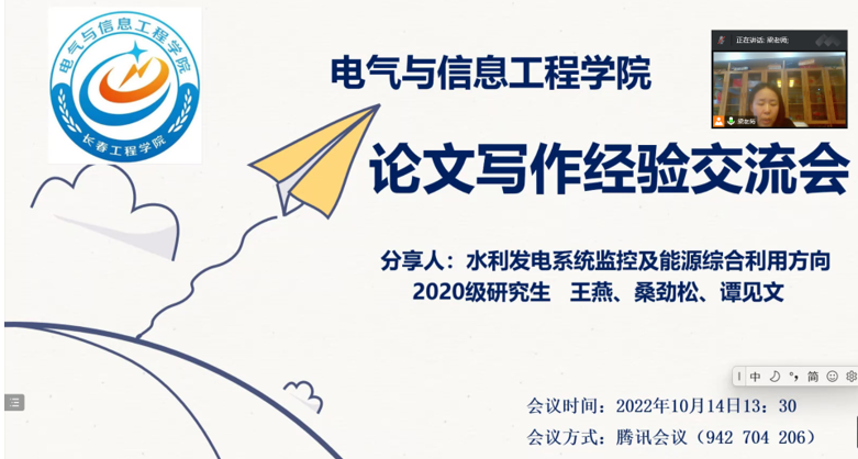 为提高研究生学术论文写作水平,10月14日下午,电气与信息工程学院举办了线上论文写作经验交流会。2020级优秀研究生代表王燕、桑劲松、谭见文分享了相关经验。电气与信息工程学院2021、2022级全体研究生及部分研究生导师参加了会议。会议由电气与信息工程学院副院长梁春辉主持。