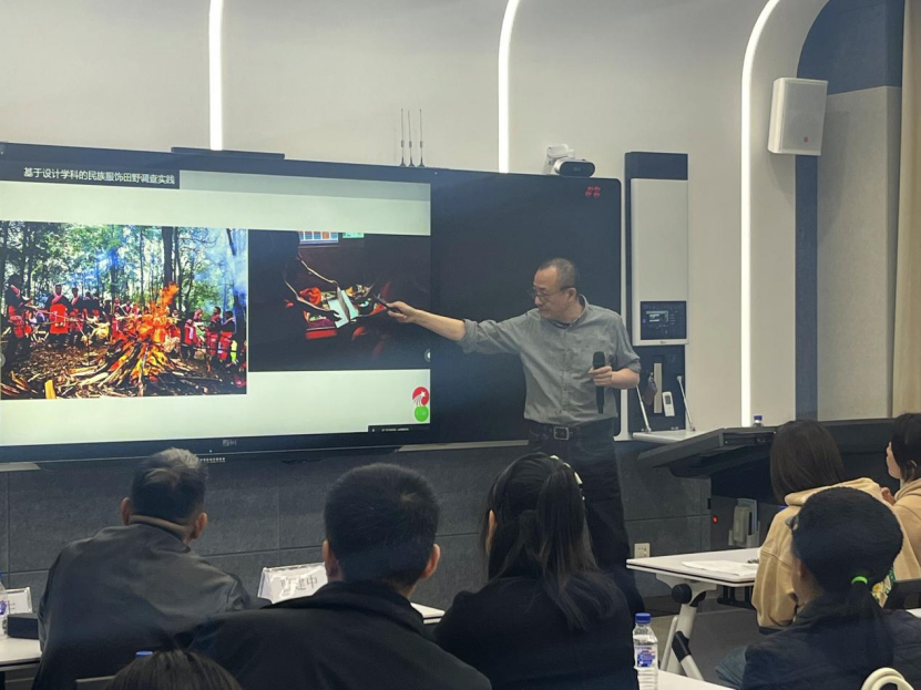 管兰生教授以“丝绸之路染缬艺术的传承与创新”为主题,讲授了传统染缬艺术的“染”和“缬”的传统技艺及方法,并展示了传统染缬的创新应用成果,服装服饰设计专业学生聆听的同时动手实操,感受中华传统技艺的魅力。曹建中教授以“基于设计学科的民族服饰田野调查实践”为主题,分析解读了中国少数民族的形成、民族服饰文化的特色及田野调查的“看、试、记、整”方法。两位教授还与师生们分享了非遗项目的选题凝练与研究路径、实践方法与成果转化等经验和心得,传递了非遗技艺的温度与非遗传承人的热忱,令广大师生受益匪浅。