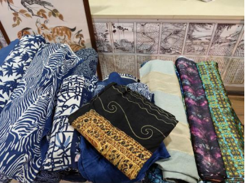 在调研参观中,兰州交通大学染缬艺术研究所(博物馆)馆长管兰生教授详细讲解染缬技艺发展史、传统染缬制作工艺、非遗传承和市场推广情况,展示了染缬艺术优秀作品,陪同团队参观了研究所的染缬器物藏品,包括古代纺染工具、染料以及传统染缬制作工艺,还有植物染料萃取,蜡染、扎染、糊染、夹染等染缬创作材料。