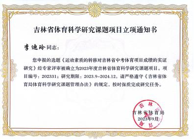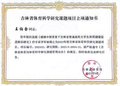 近日,吉林省体育局公布了2023年科学研究课题立项结果,共立项62项,其中,我校体育教研部在科研工作中取得了突破性的进展,成功获批3项科研项目,立项数量位列全省第6位。