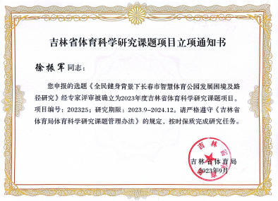 体育教研部此次共申报5项科研项目,其中徐振军老师主持申报的《全民健身背景下长春市智慧体育公园发展困境及路径研究》、王伯金老师主持申报的《健康中国背景下吉林省普通高校大学生体质健康促进路径研究》以及李迪玲老师主持申报的《运动素质的转移对吉林省中考体育项目成绩的实证研究》成功获得立项。