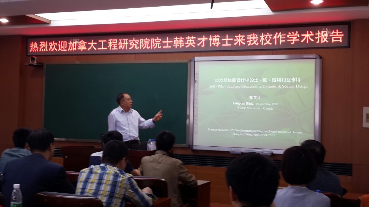 4月29日下午在东区一教226室,加拿大工程研究院院士韩英才博士以“动力及地震设计中的土-桩-结构相互作用”为题,做了精彩的学术报告。韩英才博士针对地质工程中的动力荷载及土-桩-结构相互作用的基本概念、非线性土-桩系统无反射边界模型、、桩基础的动力刚度和阻尼等三个学术前沿问题进行了工程实例分析。