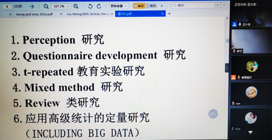 为提升教师在学术论文写作中进行实证研究的能力, 5月30日、6月6日、6月13日、6月20日和6月27日晚18:00至20:00,外国语学院邀请美国路易斯安娜州立大学博士、曲阜师范大学教育学院孟令奇教授举行了五场以《如何撰写CSSCI和SSCI索引论文》为主题的学术报告会。系列学术报告以腾讯视频会议的形式进行,外国语学院骨干教师及其他学院部分教师参加了讲座,来自全国各地高校的千余名教师也参加了学习。