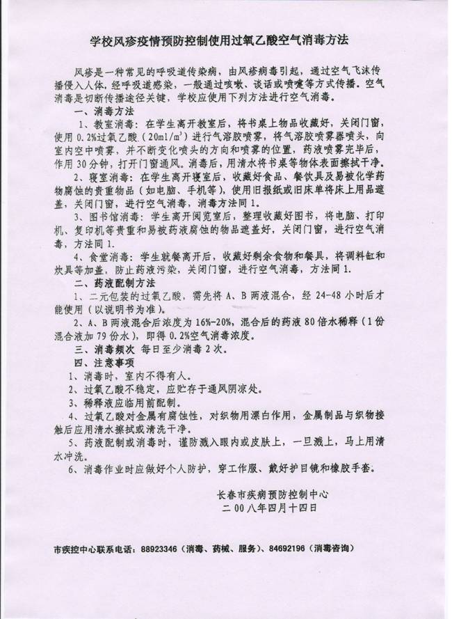 为有效预防风疹疫情,保证师生身体健康,现将长春市疾病预防控制中心印发的两份宣传材料--《乐鱼风疹疫情预防控制使用过氧乙酸空气消毒方法》、《乐鱼风疹疫情预防控制指导意见》转发给你们。请各教学单位下载后转发、宣传到各班级,教室、公寓、图书馆、食堂等各场所的管理部门要严格按照宣传材料的有关要求做好风疹疫情的预防工作。