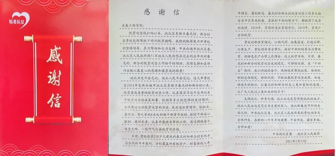 2021年,中共洮北区委、洮北区人民政府又给乐鱼在线登录入口发来了感谢信。“有情怀、能担当、善作为、肯吃苦”,信中这样形容乐鱼的驻村干部;“洮北永远是您情感依托的地方,洮北人民永远是您至亲至爱的家人”,信中这样形容双方的帮扶关系。