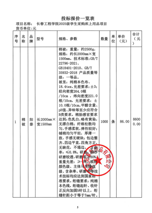 二、项目名称:乐鱼在线登录入口2025级学生采购床上用品项目